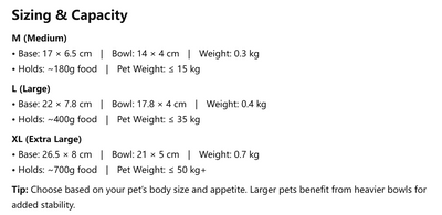 • Holds: ~180g food | Pet Weight: ≤ 15 kg