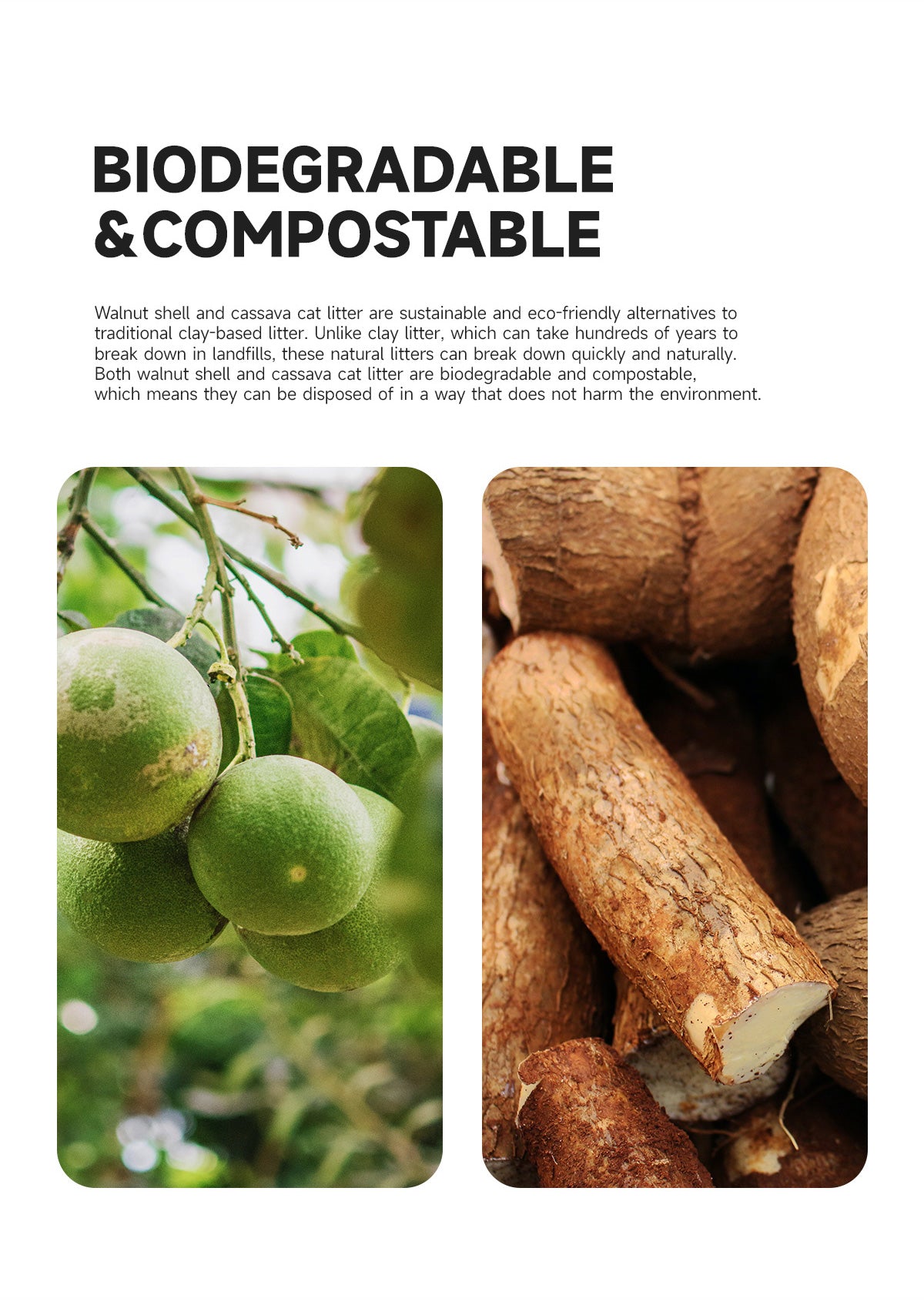 Plant-Based Formula: Made from walnut shell + cassava, renewable ingredients that are safe and sustainable.