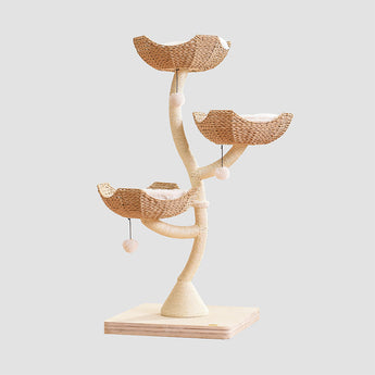 Its flower-inspired design combines real wood craftsmanship and artisanal wicker baskets, making it both a luxury cat tree and a stylish home accent.