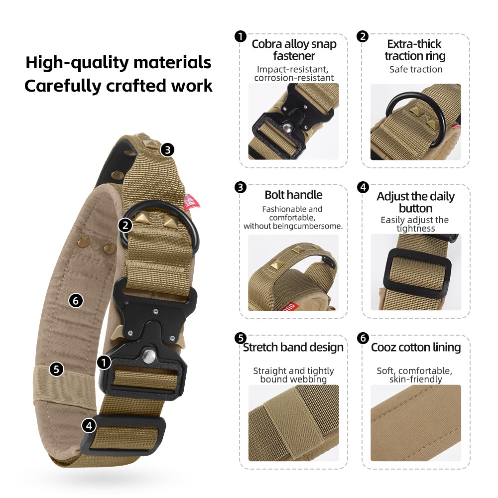Built for power, comfort, and control—this military-inspired tactical collar redefines safety and strength for medium to large dogs. With Cobra-style alloy hardware, pressure-dispersing lining, and a bold design aesthetic, every walk becomes a confident mission.