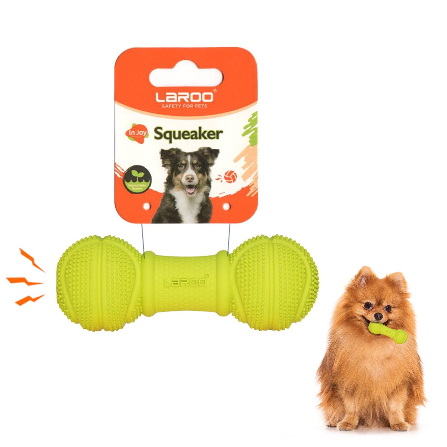 Keep your dog entertained, active, and healthy with the LaRoo Squeaky Dumbbell Rubber Dog Toy. Made from 100% safe natural rubber, this durable toy withstands chewing while protecting your pet’s teeth. The built-in squeaker adds playful sounds to encourage interactive fun, while the textured design helps clean teeth and massage gums. Available in bright orange and green, it’s a must-have for daily play and dental care.