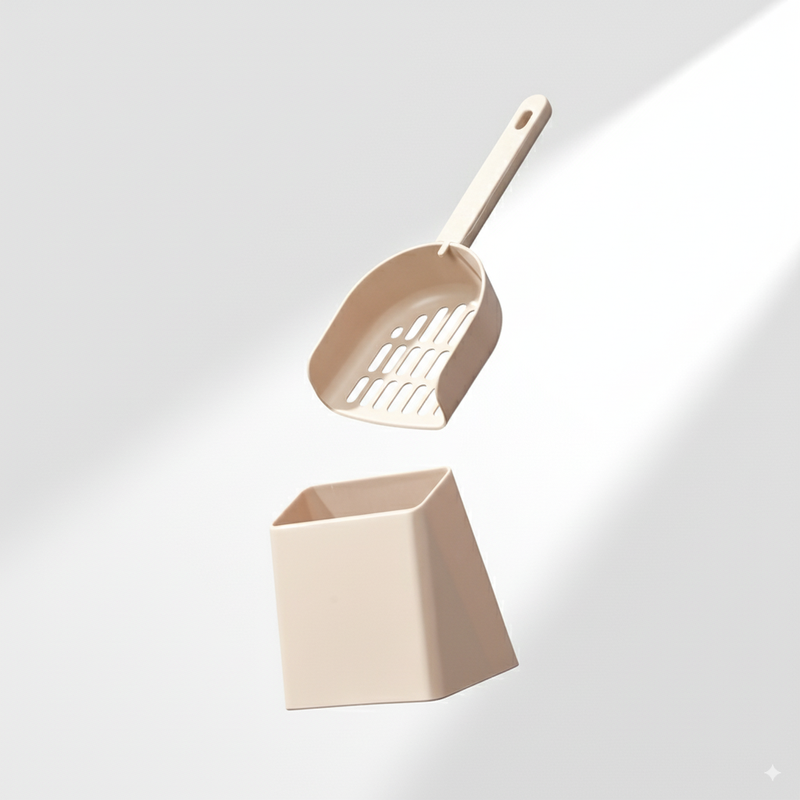 It comes with a holder/caddy to keep the scoop stored hygienically, preventing mess on your floor or litter box edges.