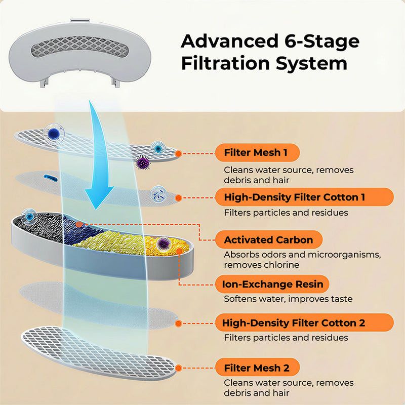 • 6-Layer Filtration System – Removes debris, hair, heavy metals, and softens water for improved taste