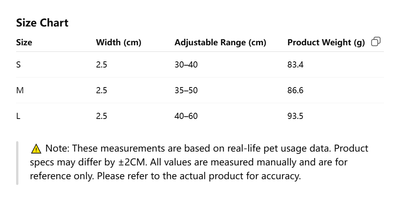 Note: Measurement data refers to the collar’s outer dimensions. For a proper fit, allow for a ~2cm difference from your pet’s actual neck size.